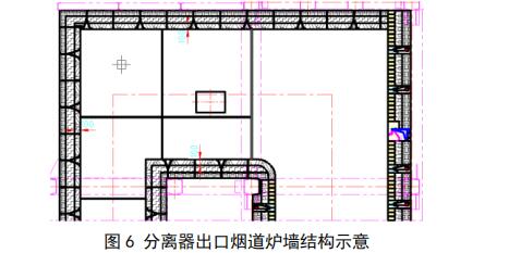 該部分處于分離器之后,工作溫度 900℃左右。從旋風(fēng) 分離器出來的攜帶部分固體粒子的氣流速度較高,對連接煙 道會造成沖刷磨損,對耐火材料要求有較好的抗磨損性能及抗熱震性能,防止脫落。耐火層材料應(yīng)采用高強(qiáng)度耐磨耐火澆注料如圖 6。