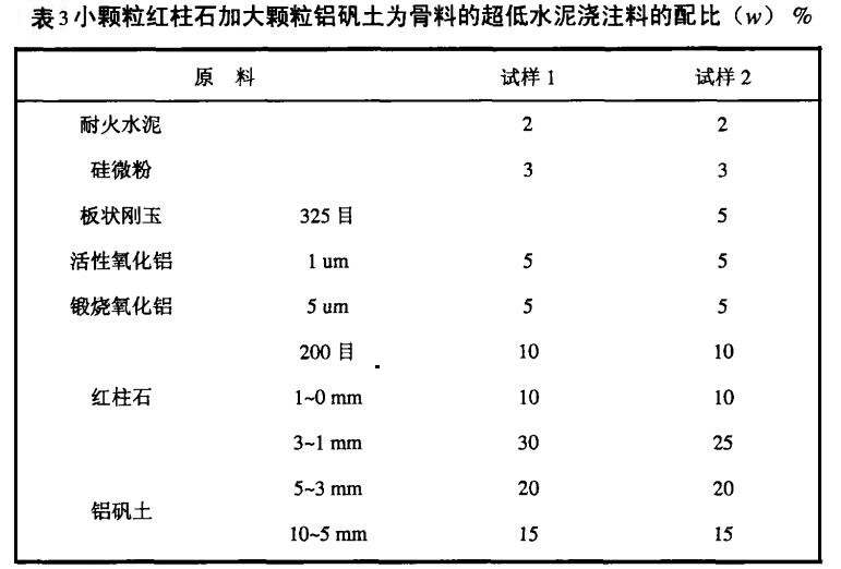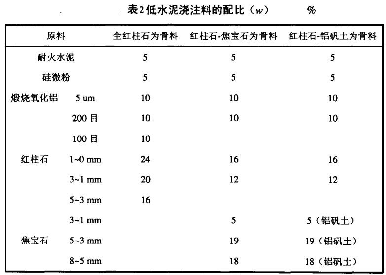 表2示出了不同低水泥骨料澆注料的配比:(1)以全紅柱石為骨料的低水泥澆注料,可用于 對(duì)熱穩(wěn)定性,抗熱震性和低蠕變性要求很高的設(shè)備中。如中間包,鋼水包和鐵水包的永久襯等。(2)紅柱石骨料的50%換成焦寶石。焦寶石是莫來(lái)石和方石英的混合物,它的各項(xiàng)性能均低于紅柱石。與全紅柱石澆注料相比,這種澆注料的性能稍有下降,但成本減少很多。(3)把全紅柱石澆注料骨料中的中大顆粒換成鋁礬土。鋁礬土的基本組成是燒結(jié)剛玉有很強(qiáng)的抗機(jī)械磨損性能。這種澆注料除紅柱石帶來(lái)的熱穩(wěn)定性,抗熱震性和低蠕變性外,鋁礬土的加入帶來(lái)了抗機(jī)械磨損性能?捎糜阡撍,鐵水包和高爐的鐵水溝工作襯。
