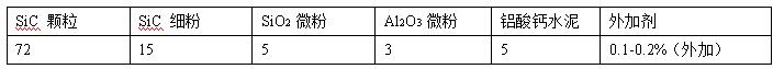 試驗用主要原料為:工業(yè)SiC顆粒,w(SiC)≥98%,粒度0-0.5、0.5-1.5、1.5-3mm;SiC細粉,w(SiC)≥97.5%粒度≤0.1mm;SiO2微粉,w(SiO2)≥95%粒度≤2 μm)Al2O3微粉,w(Al2O3)≥98.5%,粒度≤5μm;鋁酸鈣水泥 Secar71,w(Al2O3)=69.3%,w(CaO)=29.7%。按表 1進行配料,加入適量的外加劑和水進行混料,振動澆注成型為160mm×40mm×40mm 的試樣,而后將其在室溫養(yǎng)護 24h、110℃干燥處理10h、空氣氣氛下1000℃煅燒5h 制得實驗用試樣。該試樣的物理性能如下:體積密度2.68 g·cm-3,顯氣孔率 14.1,耐壓強度 176 MPa,常溫抗折強度 16.2 MPa。