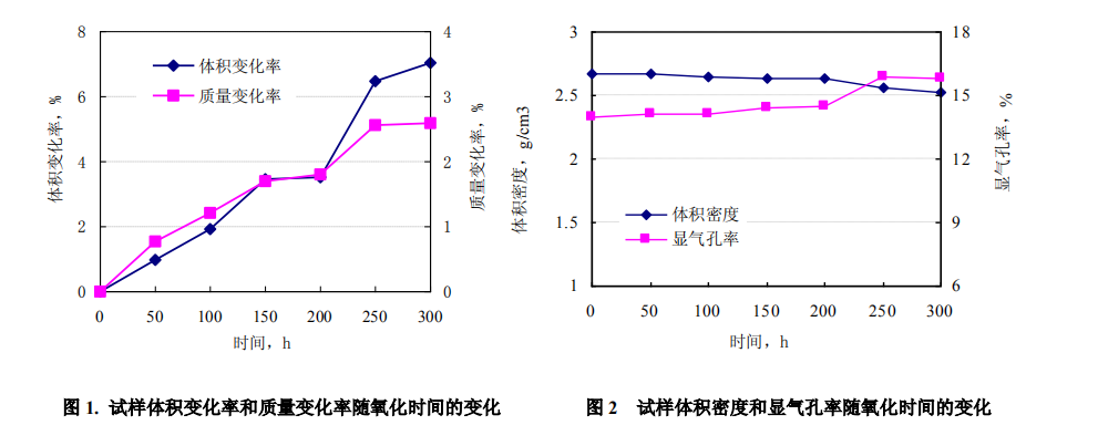 圖1給出了試樣的體積變化率和質(zhì)量變化率隨氧化時間的變化關(guān)系,圖2為試樣體積密度和顯氣孔率隨氧化時間的變化關(guān)系。由圖 1、圖2可知,0-150h 氧化過程中,試樣體積和質(zhì)量隨氧化時間增加而明顯增大,體積密度緩慢降低顯氣孔率基本不變;150-200h階段試樣體積、質(zhì)量、體積密度和顯氣孔率基本保持不變;氧化時間由200h增至250h后試樣的質(zhì)量、體積和顯氣孔率增大明顯,體積密度有較明顯的降低;氧化時間由 250h 增至 300h 后,試樣的質(zhì)量和顯氣孔率增幅明顯減小,體積仍有較明顯增大、體積密度少量降低。