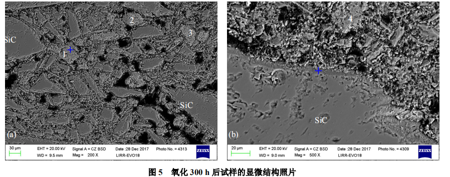圖 5(a)、圖(b)表示氧化300h后試樣的顯微結(jié)構(gòu),其特征與圖4基本一致,圖5中1、2、3、4 區(qū)域組成與圖4(a)中3相近,區(qū)域1邊緣“+”點能譜分析分析結(jié)果為(x,%):CaO 11.31 Al2O3 65.30 SiO2 23.00 Fe2O3 0.11,SiO2/ CaO 約為2,推測圖5中的1、2、3、4 區(qū)域主要為CAS2。圖5(b)SiC顆粒邊緣“+”點能譜分析結(jié)果為(x,%):Si 58.94,Al 0.18,O 7.75,C 33.57。表明 SiC 顆粒表面氧化后形成了一層氧化層,其組成為方石英或SiO2質(zhì)玻璃相。