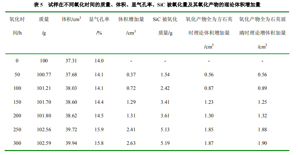 氧化產(chǎn)物為方石英或SiO2玻璃,根據(jù) SiC 和 SiO2的分子量以及SiC、方石英、SiO2 玻璃的密度SiC的 3.21 g·cm-3,方石英的2.23 g·cm -3,SiO2玻璃的2.20 g·cm -3,SiC按上述反應(yīng)產(chǎn)生的質(zhì)量和體積變化的推算結(jié)果見表4。可見,試樣中每單位質(zhì)量SiC與蒸汽發(fā)生氧化反應(yīng)后,質(zhì)量增加49.9%,體積增大約1.2 倍。