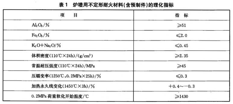 3.1 爐墻用不定形耐火材料(含預(yù)制件)的理化指標(biāo)應(yīng)符合表1的規(guī)定