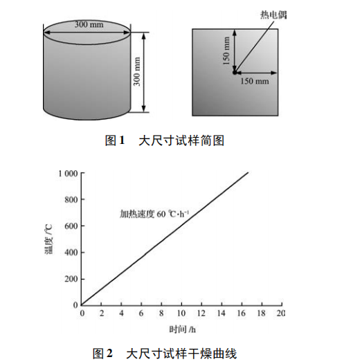 試樣的簡圖示于圖 1。圖 1 所示試樣的尺寸是Φ300 mm × 300 mm,熱電偶置于150 mm × 150 mm中心位置,混煉好的澆注料進(jìn)行澆注,養(yǎng)生 24 h。如圖2所示,脫模后以 60 ℃ / h 的速度加熱到1 000 ℃。根據(jù)所獲得的試樣內(nèi)部溫度曲線對(duì)干燥特性進(jìn)行了評(píng)價(jià)