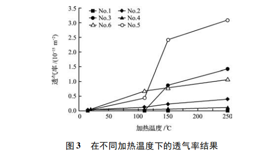 測(cè)定結(jié)果示于圖3。根據(jù)這次測(cè)定的結(jié)果,從養(yǎng)生到250 ℃加熱處理,沒有加入添加劑的試樣幾乎沒有透氣性。為了提高養(yǎng)生體脫水時(shí)的透氣率,加入了特殊添加材料X的No.2試樣、No.5 和 No.6試樣在從養(yǎng)生到加熱250 ℃時(shí)透氣性有所提高。另外發(fā)現(xiàn)加入了有機(jī)纖維A 的No.3和No.5試樣,在150 ℃加熱時(shí)透氣率提高很大。加入了有機(jī)纖維B的No.4 試樣和 No.6 試樣,在150 ℃和250 ℃加熱時(shí)透氣率提高。并用特殊添加材料和有機(jī)纖維的No.5 試樣和No.6 試樣,由于疊加效果的作用,透氣率大幅度提高。尤其是No.5 試樣,150 ℃ 加熱后透氣率顯著提高,特殊添加材料和有機(jī)纖維A并用特別有利于形成連通氣孔。