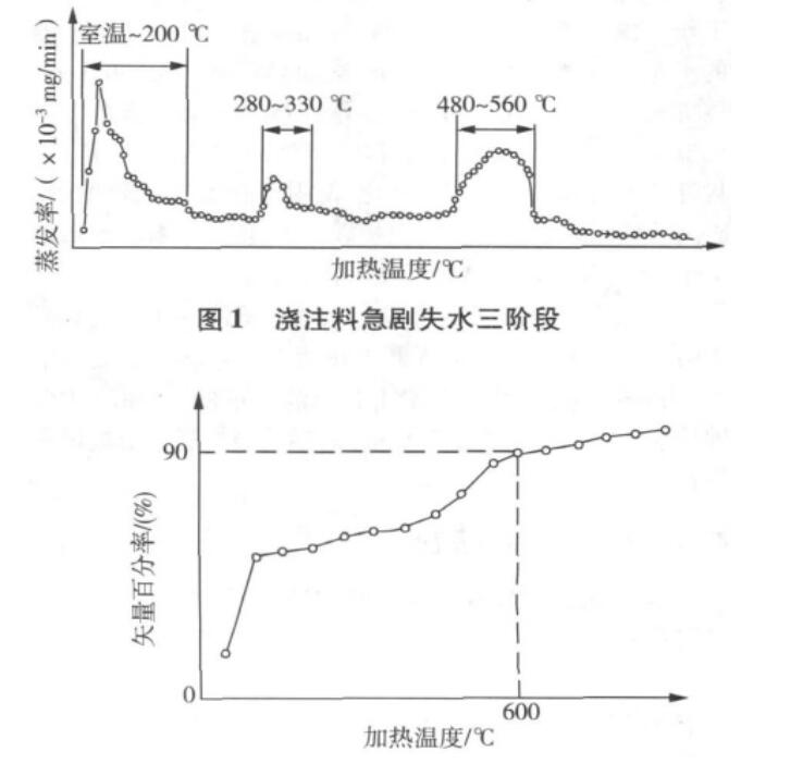 由以上的脫水反應(yīng)方程式看出,水泥中的石水化合物和骨料中的結(jié)合水的脫水溫度與澆注料急劇失水階段一致。
