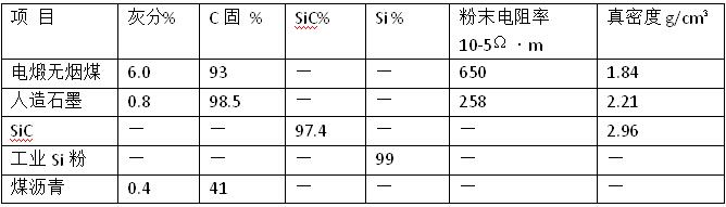 原料選用經1750-2000℃的電煅燒無煙煤此時已經半石墨化,石墨化呈度達15%~30%,它的結構致密、強度高。因此,以其作為主要原料。為提高導熱系數、耐堿性,改善成型性,加入少量人造石墨。另外加入SiC,原因在于SiC比碳優(yōu)先氧化生成SiO。保護膜,覆蓋于表面,阻止制品進一步氧化,可提高炭制品的抗氧化性。為提高材料的質量,加入少量工業(yè)硅微粉,在焙燒成過程中,工業(yè)硅微粉與碳發(fā)生了Si(s)+C(s)→β-SiC(s)反應 ,生成物β-SiC,可賦予制品較高強度和耐磨性少量氣孔壁上未反應的Si與氣孔中的氧、氮發(fā)生4Si(s)+ 2N2 (g)+ O2 (g)→2Si2ON2 (s)反應 Si2ON2 為針狀結晶,使氣孔變細或封閉、堵塞氣孔,降低制品透氣度,阻止渣、鐵的滲透,提高耐氧化性。各種原料的理化性能見表1。