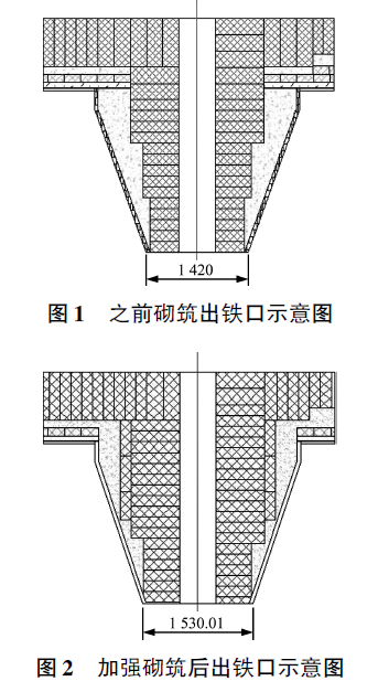 出鐵口袖墻渣線部位和出鐵口轉(zhuǎn)角墻處侵蝕比較嚴(yán)重,袖墻使用600mm的鋁碳化硅碳磚和高檔預(yù)制塊磚加強(qiáng)砌筑,同時(shí)里側(cè)再加厚砌筑150mm鋁碳化硅碳磚。出鐵口轉(zhuǎn)角墻使用寬厚度的鋁碳化硅碳磚每層交叉砌筑,起錯(cuò)縫和加固作用。出鐵口袖墻砌墻高度在鐵水液面以上時(shí)支模澆注小拱頂。出鐵口加強(qiáng)砌筑情況如圖1和圖2所示。