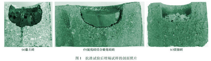 抗渣試驗(yàn)采用靜態(tài)坩堝試驗(yàn)方法,在試樣的中間鉆取內(nèi)孔φ36mmX30mm的坩堝試樣,將20g煙塵渣放入坩堝內(nèi)孔中,在1300℃保溫24h后,沿坩堝中心軸切開(kāi),觀測(cè)其侵蝕情況,試樣的剖面照片見(jiàn)圖1,可以看出:粘土磚侵蝕最為嚴(yán)重,氮化硅結(jié)合碳化硅磚次之,鎂鉻磚幾乎沒(méi)有侵蝕。