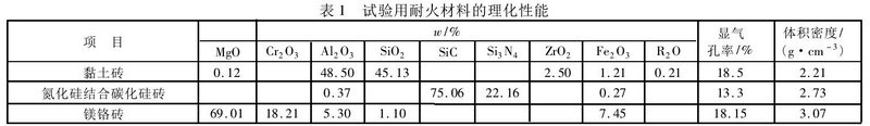 煙塵的主要化學(xué)組成為:SiO2 10.52%,CaO 37.27%,Fe2O3 29.64%MgO 4.34%,AL2O3 2.21%,MnO 2.56%TiO20.85%,K2O 0.02%,Cr2O3 1.13%,ZnO 7.05%?梢(jiàn)該煙塵為堿性渣。使用的三種耐火磚的主要理化指標(biāo)見(jiàn)下表