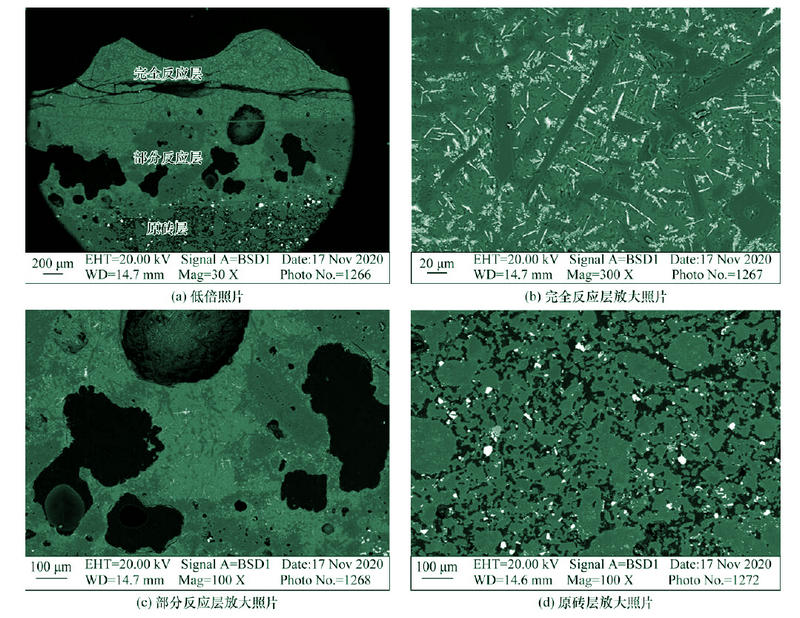 抗渣試驗(yàn)后的鎂鉻磚試樣可分成附渣層、致密界面層、滲透反應(yīng)層和原磚層四層。根據(jù)各層的放大照片分析認(rèn)為:高溫下液態(tài)煙塵渣能滲透到鎂鉻磚中,但鎂鉻磚中主要成分方鎂石、鎂鉻尖晶石不容易與煙塵渣反應(yīng)生成低熔點(diǎn)物相,因此鎂鉻磚具有優(yōu)異的抗煙塵渣侵蝕性。