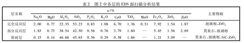抗渣試驗(yàn)后粘土磚試樣的SEM照片見(jiàn)圖2,由圖2a可以看出,侵蝕后試樣可分為完全反應(yīng)層、部分反應(yīng)層和原磚層三成。根據(jù)各層的放大照片圖2b)、圖2c)和圖2d)一級(jí)各層的EDS面掃描分析結(jié)果(見(jiàn)表2),經(jīng)分析認(rèn)為:高溫下液態(tài)煙塵渣與粘土磚接觸后發(fā)生滲透、侵蝕反應(yīng),粘土磚中的主要成分SiO2、AL2O3容易溶解到煙塵渣中。因此粘土磚抗煙塵渣侵蝕性較差。