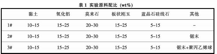 1.1原料,實(shí)驗(yàn)主要原料如下:粘土、煅燒氧化鋁(Al203)99%,煅燒莫來石粉A1203>65%,板狀剛Al20399.4%、藍(lán)晶石和硅線石。實(shí)驗(yàn)所用的泡沫劑為十二烷基磺酸鈉,所用的燃盡物為鋸末和聚丙乙烯球,結(jié)合劑為聚乙烯醇(PVA)。