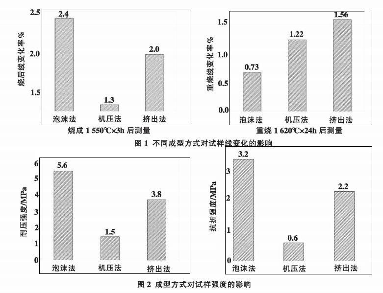 采用泡沫法制備的莫來石質(zhì)隔熱耐火磚具有燒后線收縮率大而重?zé)收縮率小的特點(diǎn),其主要原因是其結(jié)構(gòu)更加均勻,氣孔的孔徑分布呈現(xiàn)微-納米共存的兩極分布,燒結(jié)更加充分導(dǎo)致的。另一方面,采用機(jī)壓法制備的莫來石質(zhì)隔熱耐火磚燒后線收縮率和重?zé)收縮率均比以擠出法制備的要小,這主要是成型過程的受力方向不同所致,采用機(jī)壓法制備的樣品在燒成過程中會產(chǎn)生一定程度的膨脹。