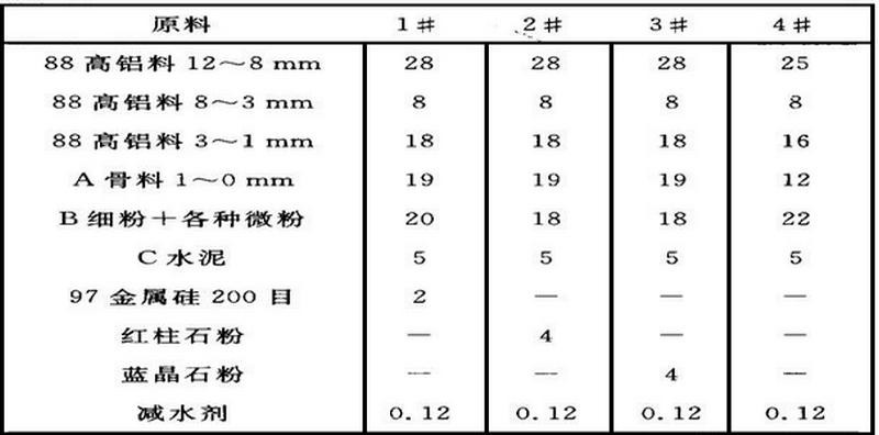 結(jié)果與討論;(1)固定骨料細粉組成和減水劑的比例,適當(dāng)調(diào)整抗收縮原料的種類和比例,施工加水量變化不大。(2)由4#配方可看出不加膨脹添加劑澆注料,高溫收縮大,高溫使用過程中易產(chǎn)生收縮裂紋,降低了使用壽命。(3)金屬硅、紅柱石粉、藍晶石粉在高溫澆注料中都起到一定的高溫抗收縮性能。
