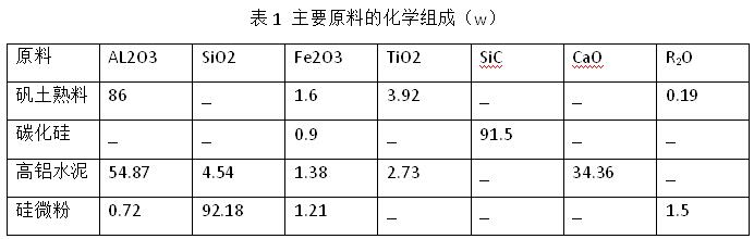 實(shí)驗(yàn)所用原料為特級(jí)礬土熟料(體積密度3.15g·cm-3)、碳化硅、硅微粉、燒結(jié)劑、高強(qiáng)度高鋁水泥,化學(xué)組成見(jiàn)表1、