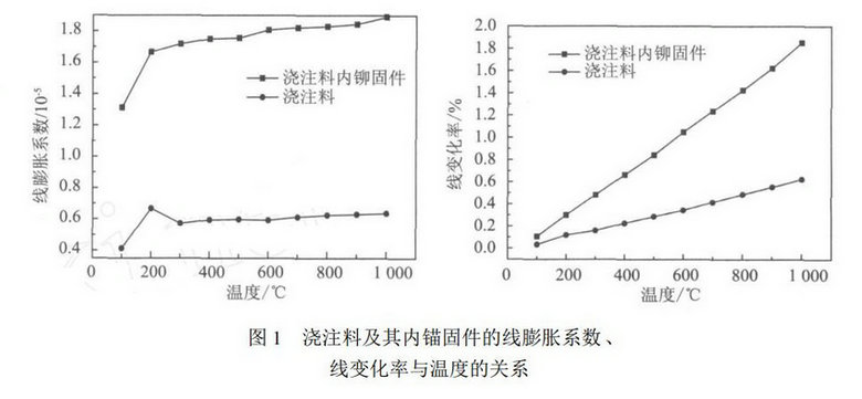 所以必須綜合考慮固件表面膨脹縫的處理,如果縫隙留的過大,錨固件與澆注料分離容易氧化斷裂,起不到固效果。如果留的小容易引起澆注料的膨脹開裂。1分別是澆注料及其內(nèi)錨固件的線膨脹系數(shù)、線變化率與溫度的關(guān)系圖從圖上可以看出;隨著溫度增加澆注料與其內(nèi)錨固件的線膨脹系數(shù)、線變化率差異增大,錨固件的線膨脹系數(shù)是澆注3 ,因此在爐窯加熱的過程中必須考慮錨固件的加熱膨脹量的問題。