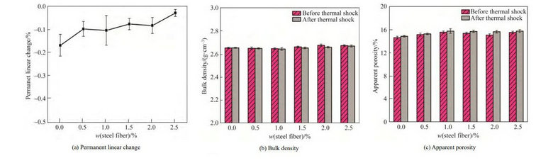 圖2為莫來石質(zhì)澆注料熱震前后的性能變化。由圖2a可見,熱震后澆注料的抗折強(qiáng)度保持率呈現(xiàn)先增加后降低的變化規(guī)律,當(dāng)鋼纖維加入量為1.5%時(shí),熱震后抗折強(qiáng)度保持率達(dá)到最大,這表明鋼纖維的引入有助于提高材料的斷裂韌性,減緩熱震過程中內(nèi)部缺陷的生成擴(kuò)展,提升澆注料的抗熱震性,但過量鋼纖維可能會(huì)導(dǎo)致澆注料內(nèi)部缺陷數(shù)量和尺寸增加,反而降低材料的抗熱震性。