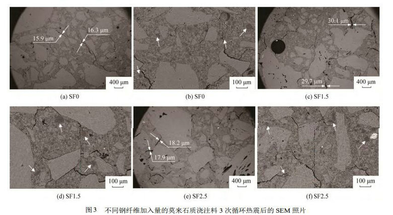 結(jié)論:少量鋼纖維(不大于1.0%)加入時(shí),澆注料的斷裂能、抗熱應(yīng)力損傷因子會(huì)隨鋼纖維量增加呈下降趨勢:當(dāng)其加入量介于1.0%~2.0%之間時(shí),澆注料的抗裂紋擴(kuò)展能力隨鋼纖維加入量增加而增加,進(jìn)而提高了抗熱震性能;但過量鋼纖維(大于2.0%)會(huì)導(dǎo)致抵抗微裂紋擴(kuò)展能力的再次下降。 抗熱震性試驗(yàn)過程中,澆注料內(nèi)部缺陷的數(shù)量和尺寸會(huì)隨鋼纖維加入量增大而增加,導(dǎo)致彈性模量保 持率和超聲波波速保持率的持續(xù)下降,而抗折強(qiáng)度 保持率則呈現(xiàn)先增加后降低的變化規(guī)律。