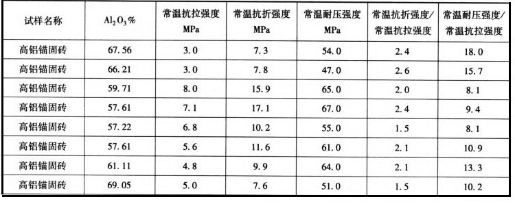 高鋁錨固磚作為高溫材料,其損壞機理主要是熱機械應力。在實際應用中,當材料的局部壓應力達到耐壓強度,或者局部拉應力達到抗拉強度時,裂紋就在此處最先形成,在熱應力和殘余應力的綜合作用下擴展,最終造成高鋁錨固磚的開裂和剝落。 以下是實驗測試各種不同的AL2O3含量的錨固磚抗拉強度。