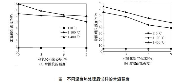 圖1示出了不同溫度熱處理后試樣的常溫強(qiáng)度。從圖中可以看出,試樣的常溫強(qiáng)度隨氧化鋁空心球加入量的增加而降低。同時(shí),隨著熱處理溫度升高,試樣的常溫強(qiáng)度逐漸增大。當(dāng)氧化鋁空心球加入量為9%時(shí),1400℃熱處理后試樣的常溫抗折強(qiáng)度和常溫耐壓強(qiáng)度分別為11.9和47.1MPa.110 ℃烘干后試樣的強(qiáng)度主要由莫來(lái)石骨料的本征強(qiáng)度提供。但基質(zhì)與細(xì)粉的結(jié)合強(qiáng)度并不高,故此時(shí)常溫耐壓強(qiáng)度較低。經(jīng)1400℃高溫處理后,骨料和微粉間燒結(jié)作用使得澆注料中的顆粒之間結(jié)合更加緊密,且氧化鋁微粉和二氧化硅微粉反應(yīng)生成莫來(lái)石,提高澆注料強(qiáng)度然而,由于氧化鋁空心球取代了部分骨料,增加試樣的氣孔率,導(dǎo)致力學(xué)強(qiáng)度下降。 但氧化鋁空心球提高了莫來(lái)石的生成量,且氧化鋁空心球的多孔結(jié)構(gòu)能夠阻礙裂紋擴(kuò)展,故其強(qiáng)度下降較少。