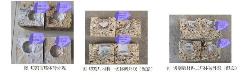 模擬項目廢硫酸原料工況,將工業(yè)級硫酸鈉、硫酸鉀和氯化鉀混合均勻配制成混合鹽,分別加入4個坯體磚坩堝內(nèi),并在混合鹽上表面覆蓋石英粉,防止熔鹽在高溫時沸濺,最后在坯體磚上蓋好耐火材料的蓋子。同時將 4 個坯體磚放入同一加熱爐內(nèi)升溫,升溫到 1 150 ℃后恒溫 1.5 h,停爐降溫。待坯體磚溫度降至常溫后,將其沿坩堝垂直方向進行帶水切割,觀察其斷面情況。切割前后坯體磚外觀。