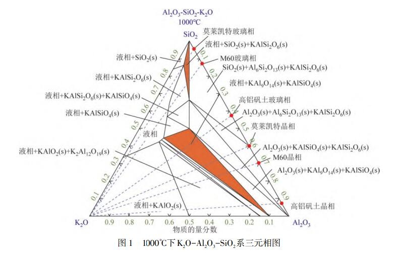 為提高硅莫磚的抗堿蒸氣侵蝕能力,一般從其結(jié)構(gòu)和組分進(jìn)行改進(jìn)。一方面,通過引入添加劑(Si、SiC、紅柱石等)利用材料制備過程的反應(yīng)體積膨脹效應(yīng),優(yōu)化硅莫磚孔結(jié)構(gòu),降低磚體孔徑尺寸,抑制堿蒸氣的侵蝕,減少其向材料內(nèi)部的滲透,提高其抗堿侵蝕性;另一方面,通過適當(dāng)提高材料基質(zhì)中的SiO2/Al2O3 (質(zhì)量比),使得制備過程材料基質(zhì)內(nèi)形成高硅氧玻璃相,其在接觸到堿后更易于轉(zhuǎn)變?yōu)橐合?/span>[K2O·SiO2(l)]圖1 ,使堿侵蝕行為由直接反應(yīng)侵蝕轉(zhuǎn)變?yōu)槿芙?/span>-析出侵蝕,侵蝕過程變緩,且不會伴隨大的體積膨脹,進(jìn)而顯著減緩材料的侵蝕速率。