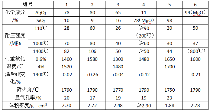 磷酸或磷酸鹽不燒磚的生產(chǎn)工藝與磷酸鹽耐火澆注料的基本相同。成型檢驗(yàn)合格的不燒磚,送至干燥室內(nèi)烘干,烘干溫度均為100~300℃,烘干時間大于48h。水泥窯用高鋁質(zhì)和鎂質(zhì)不燒磚的烘干溫度為500~800℃。表1-2為磷酸(鹽)不燒磚的性能。從表中可見,磷酸(鹽)不燒磚的荷重軟化溫度,比同材質(zhì)的水玻璃不燒磚高,強(qiáng)度也高,因此應(yīng)用廣泛,效果好。